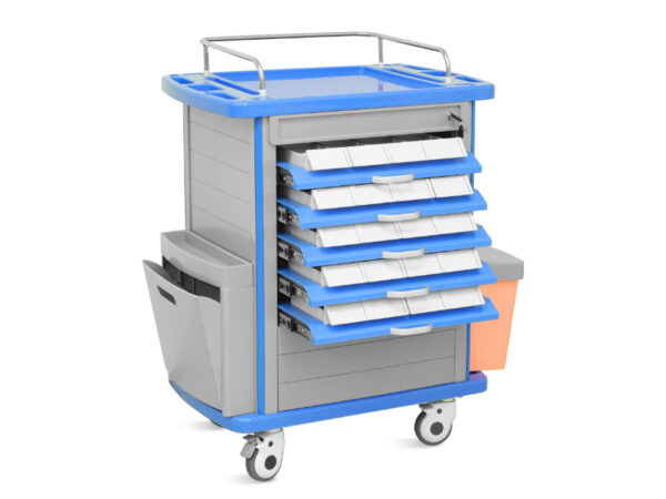 Carrello farmacia a due lati con struttura in acciaio e alluminio all’interno, in ABS e materiale antibatterico all’esterno.