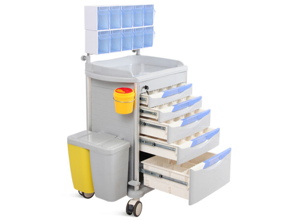 Carrello per anestesia in ABS e in materiale antibatterico all’esterno, mentre la struttura interna è in acciaio e alluminio.