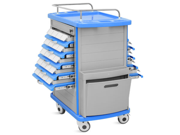 Carrello farmacia a due lati con struttura in acciaio e alluminio all’interno, in ABS e materiale antibatterico all’esterno.
