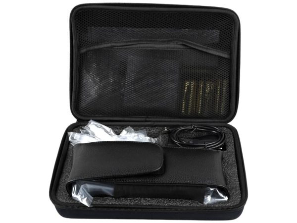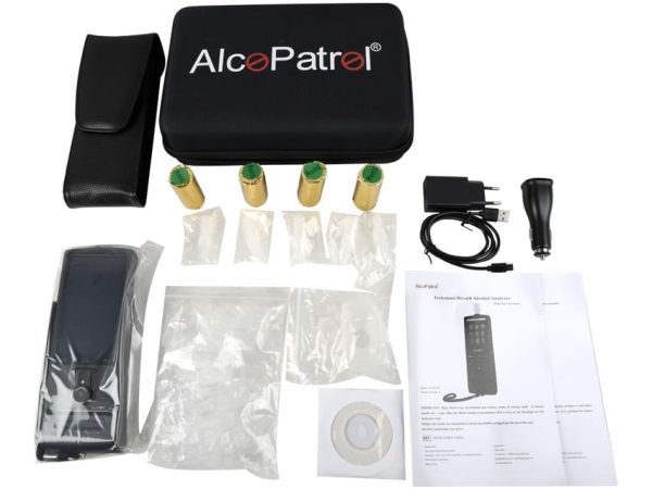 Etilometro fornito con stampante integrata, 25 boccagli, 1 boccaglio grande, cavo alimentazione 100-240V, 50/60 Hz, borsetta trasporto, 4 rotoli di carta, caricatore, cavo USB, Manuale in GB, IT.
