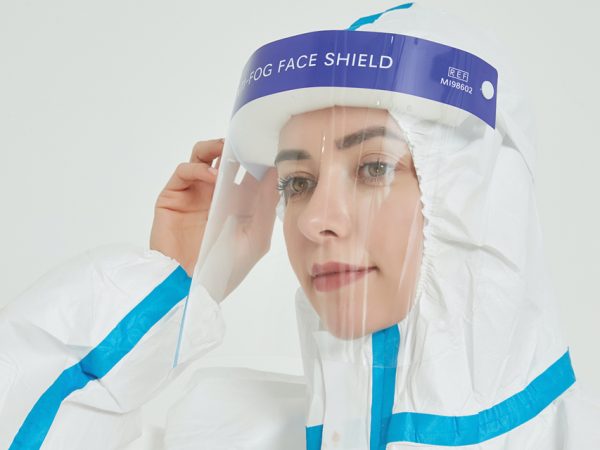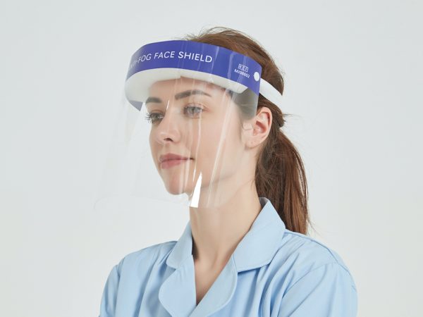 Schermo facciale protettivo monouso in pellicola idrofila antiappannante.